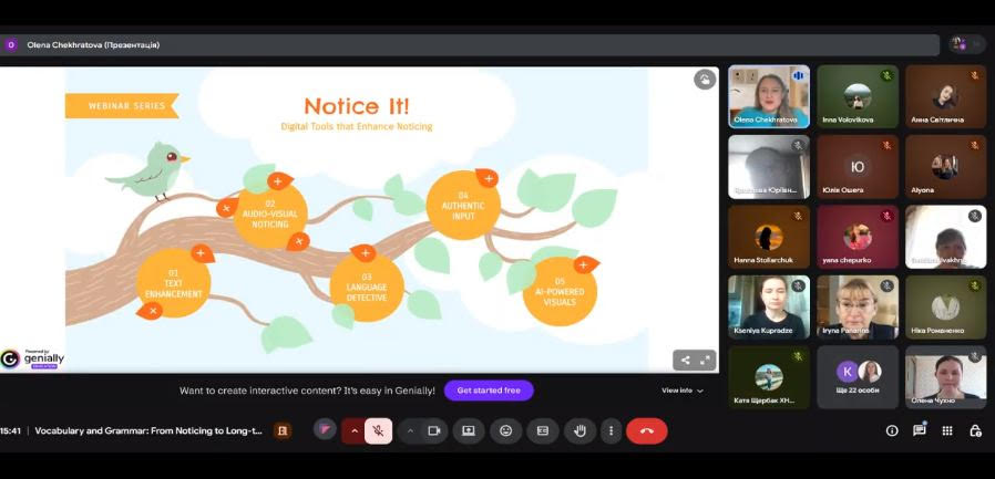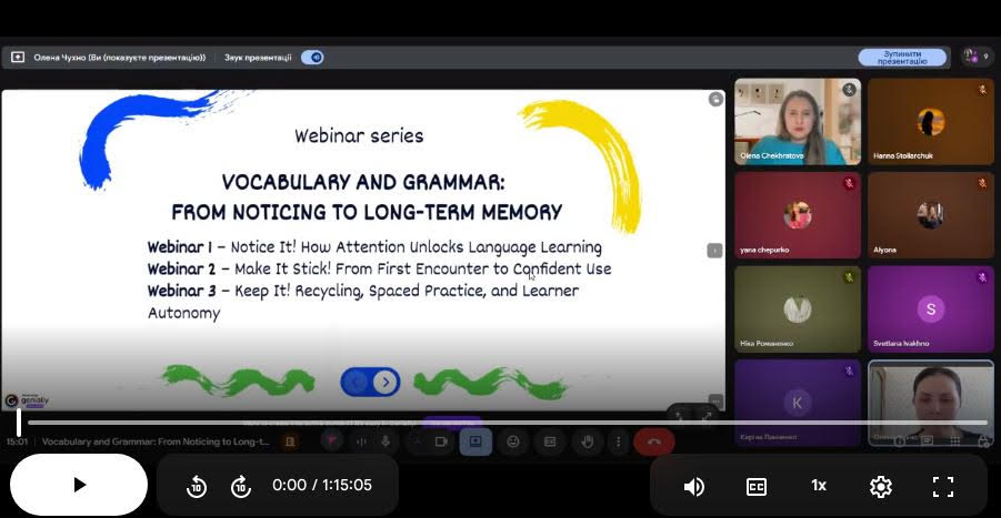На кафедрі загального мовознавства і романо-германської філології у межах роботи Сковорода-хаб успішно відбулася серія вебінарів «Vocabulary and Grammar: From Noticing to Long-Term Memory», присвячена ефективному навчанню лексики та граматики - від першого помічання мовного явища до його впевненого використання в мовленні.