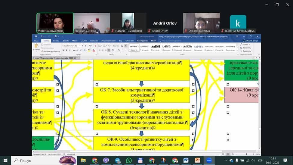 30 січня 2026 року відбулося засідання проєктної групи освітньо-професійної програми «Тифлопедагогіка. Сурдопедагогіка», кафедри спеціальної педагогіки ХНПУ імені Г.С.Сковороди. До зустрічі приєдналися і прийняли активну участь в обговоренні проекта ОП представники академічної спільноти, провідні фахівці у галузі тифлопедагогіки і сурдопедагогіки ІСПП імені М. Ярмаченка НАПН України, стейкхолдери програми та здобувачі вищої освіти (другий (магістерський) рівень). Зустріч була присвячена вирішенню таких питань: