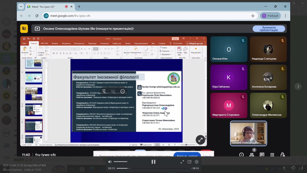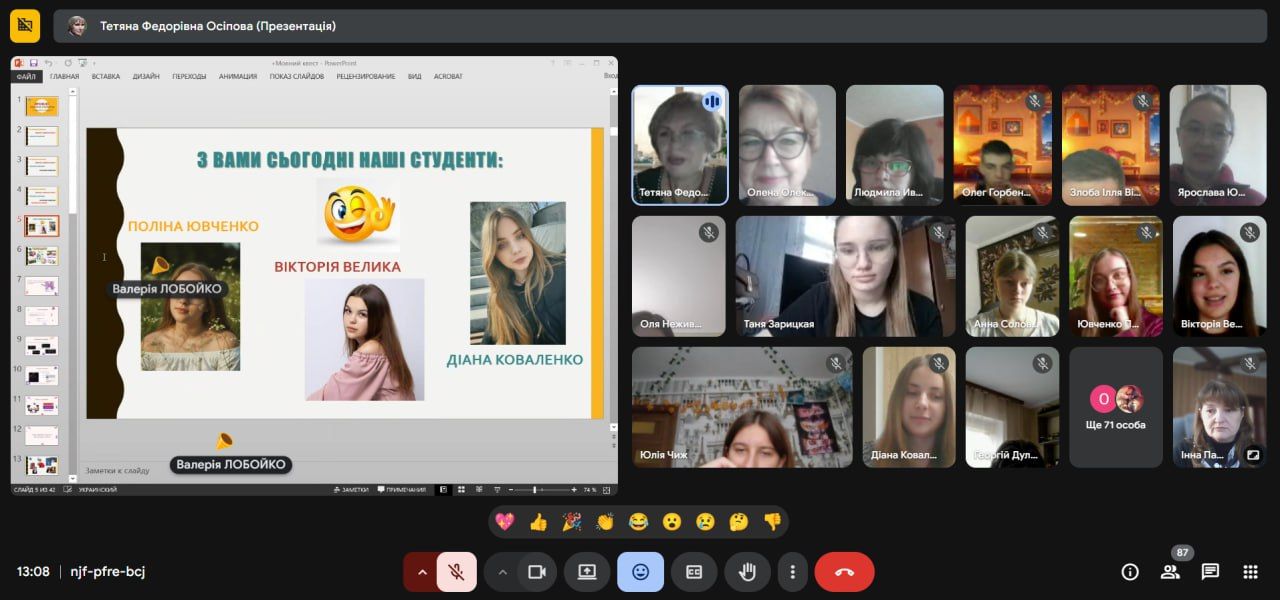13.03.2024 відбулася зустріч доцента кафедри Лазаревої Олени Сергіївни зі старшокласниками Вербівського ліцею Балаклійської міської ради Харківської області. В умовах лунаючих сирен та попереджень про небезпеку важливо було подбати про перебування дітей у безпечному місці і завдяки зусиллям директора школи онлайн зустріч було організовано у бомбосховище. Діти та вчителі ознайомились зі спеціальностями та освітніми програмами, новітніми методиками навчання та спецкурсами, переліком іноземних мов, що вивчаються на факультеті іноземної філології, міжнародними фундаціями, які співпрацюють з нашим університетом. Випускники ділилися своїми переживаннями щодо національного мультитесту, вибору спеціальності, передивлялися фрагменти наших онлайн занять та клубів. Сподіваємось зустрітися знову у наступному навчальному році вже з першокурсниками та бажаємо їм миру та успіхів у навчанні!