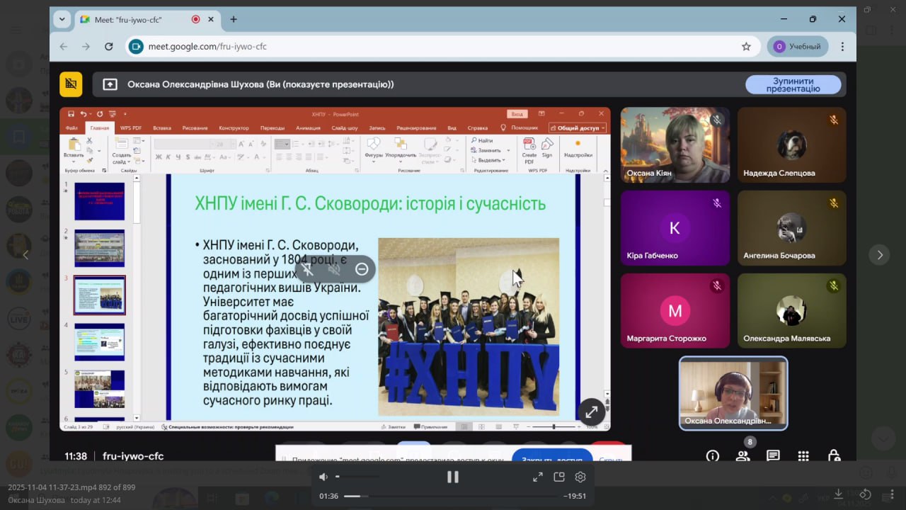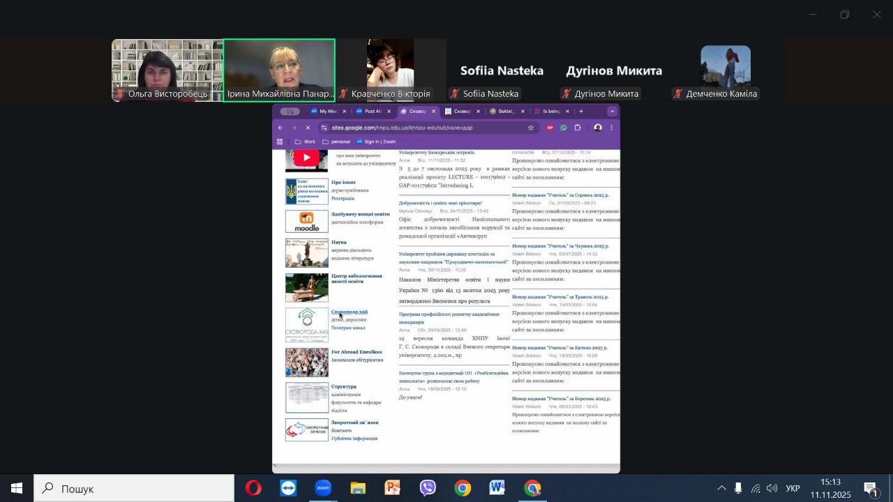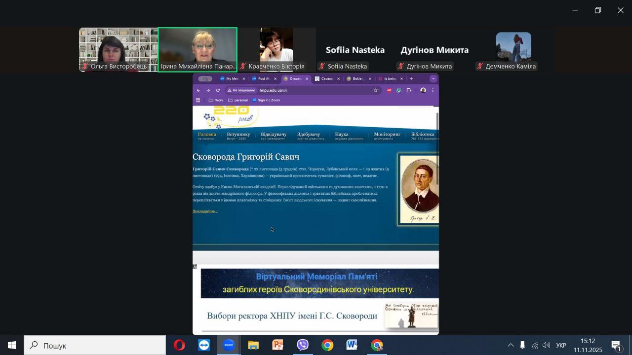 19.11.2024 р. викладач кафедри загального мовознавства і романо-германської філології Панаріна Ірина Михайлівна провела профорієнтаційну зустріч в онлайн форматі з 50 учнями 10 і 11 класів і вчителями Балаклійського ліцею Балаклійської міської ради Харківської області. Учасники ознайомилися зі структурою університету, його рейтингом серед вищих навчальних закладів України, факультетами, спеціальностями та освітніми програмами бакалаврського рівня, які пропонуються у ХНПУ імені Г.С. Сковороди. Особливу увагу приділили діяльності факультету іноземної філології, європейським і східним мовам, які вивчаються на факультеті, можливості отримати спеціальності: Середня освіта (англійська, німецька, французька мови та зарубіжна література), Філологія (германські мови та літератури (переклад включно) та безкоштовно навчатися в університетах-партнерах Європи в рамках академічної мобільності. Учасникам продемонстрували сайт ХНПУ імені Г.С. Сковороди, а також сторінку освітнього хабу, який проводить підготовку до НМТ, і запросили вступати в наш університет.