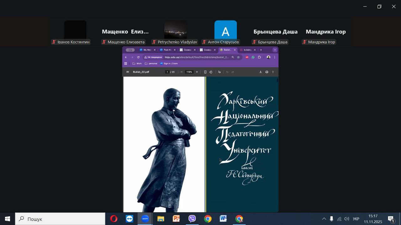 11 листопада 2025 року викладач кафедри загального мовознавства і романо-германської філології Панаріна Ірина Михайлівна провела зустріч з профорієнтації в онлайн форматі з учнями 10 і 11 класів Балакліївського ліцею Балаклійської міської ради Харківської області. Учасники ознайомилися з традиціями, організацією навчальної та виховної роботи, структурою університету, факультетами, спеціальностями та освітніми програмами бакалаврського рівня. Учні зацікавилися роботою освітнього хабу, який проводить безкоштовні заняття з підготовки до НМТ. Більш детальну інформацію учасники отримали про роботу факультету іноземної філології і програми академічної мобільності. Маємо надію, що наша зустріч надихнула учнів і наступного року вони будуть вступати до нашого ЗВО.