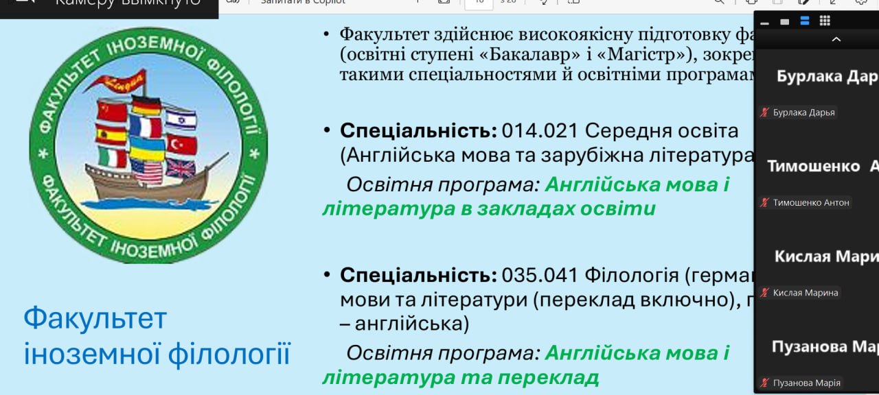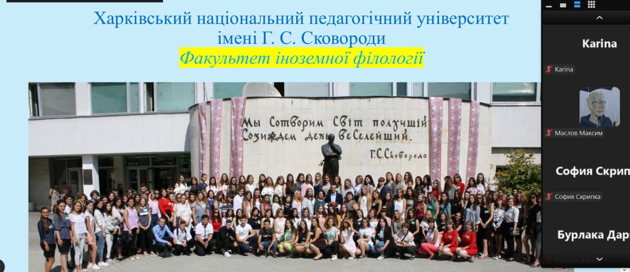 Кафедра ЗМ і РГФ налагоджує співпрацю не тільки з навчальними закладами Харківщини, але й сусідніх областей. Так, 1 травня 2024 викладач кафедри Ситнікова В.К. провела онлайн зустріч з одинадцятикласниками КЗ Сумська спеціалізована школа І-ІІІ ступеня № 7 імені Максима Савченка Сумської міської ради. Метою зустрічі була популяризація ХНПУ імені Г.С. Сковороди та запрошення старшокласників на навчання. Присутніх ознайомили з історією та структурою ХНПУ, з новоствореним Сковорода-хабом, метою якого є надання безоплатних освітніх послуг для учнів, батьків, учителів, зокрема, допомога старшокласникам у підготовці до НМТ, особливостями вступу-2024; окрему увагу приділили факультету іноземної філології та специфіці навчання тут. Учасники заходу отримали необхідні покликання і контакти.