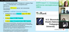 Було представлено факультет іноземної філології, кафедру загального мовознавства і романо-германської філології ХНПУ ім. Г.С. Сковороди. Калініченко Т.М. акцентувала увагу на освітньому проєкті "Сковорода-хаб", запросила учнів доєднуватися до семінарів, лекцій і занять, зокрема тих, що направлені на підготовку до складання НМТ, презентувала корисні посилання. Учні виявили зацікавленість проєктом, ставили питання, були активними і енергійними.