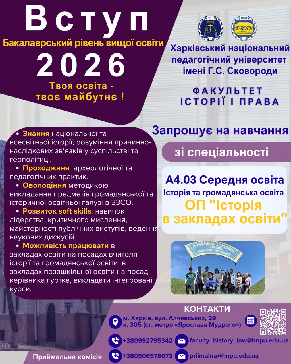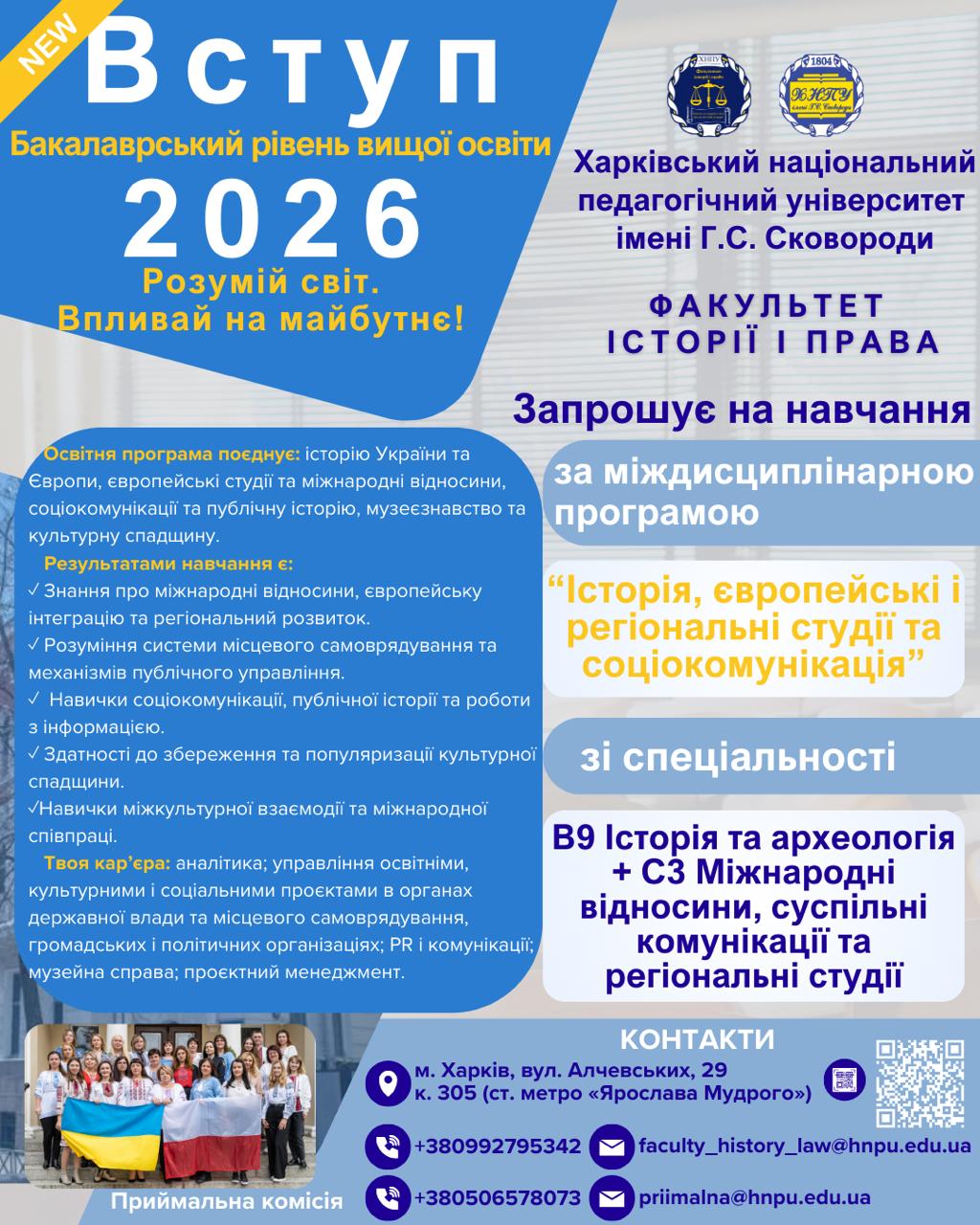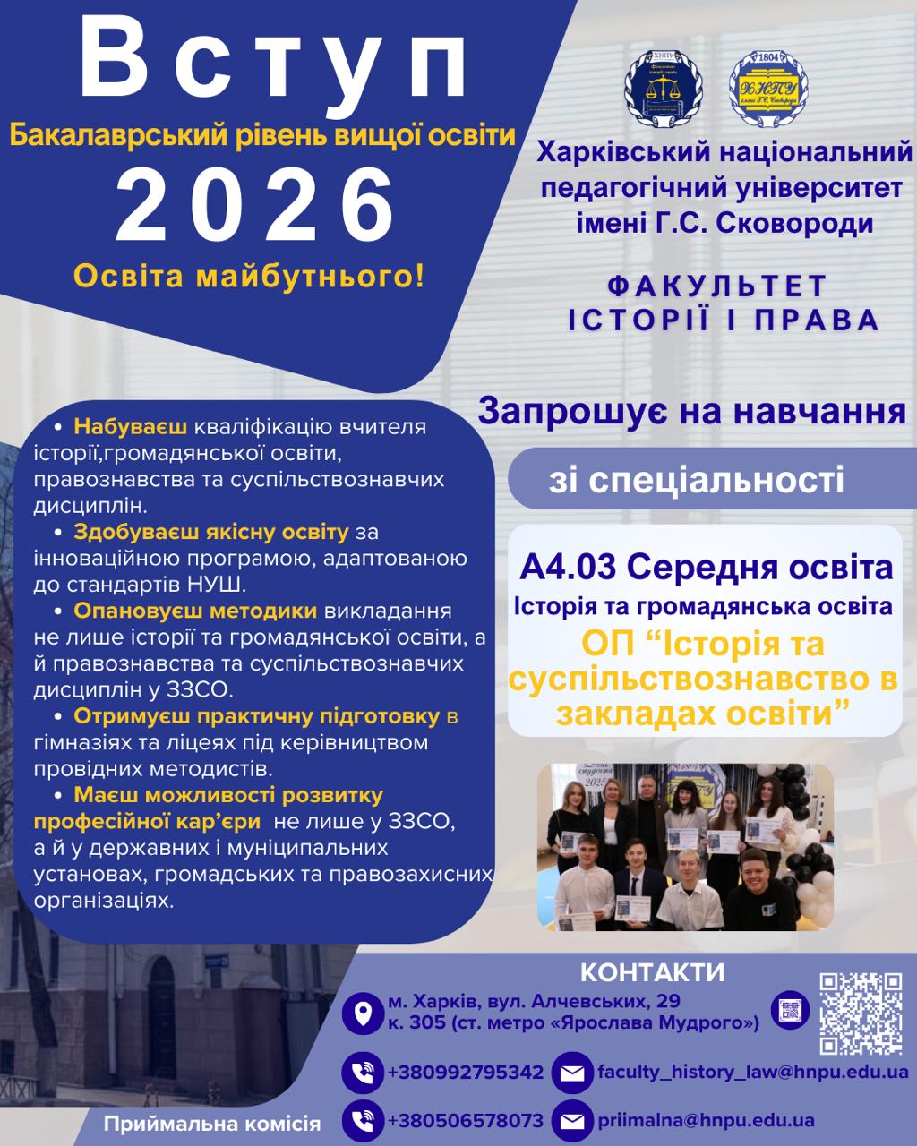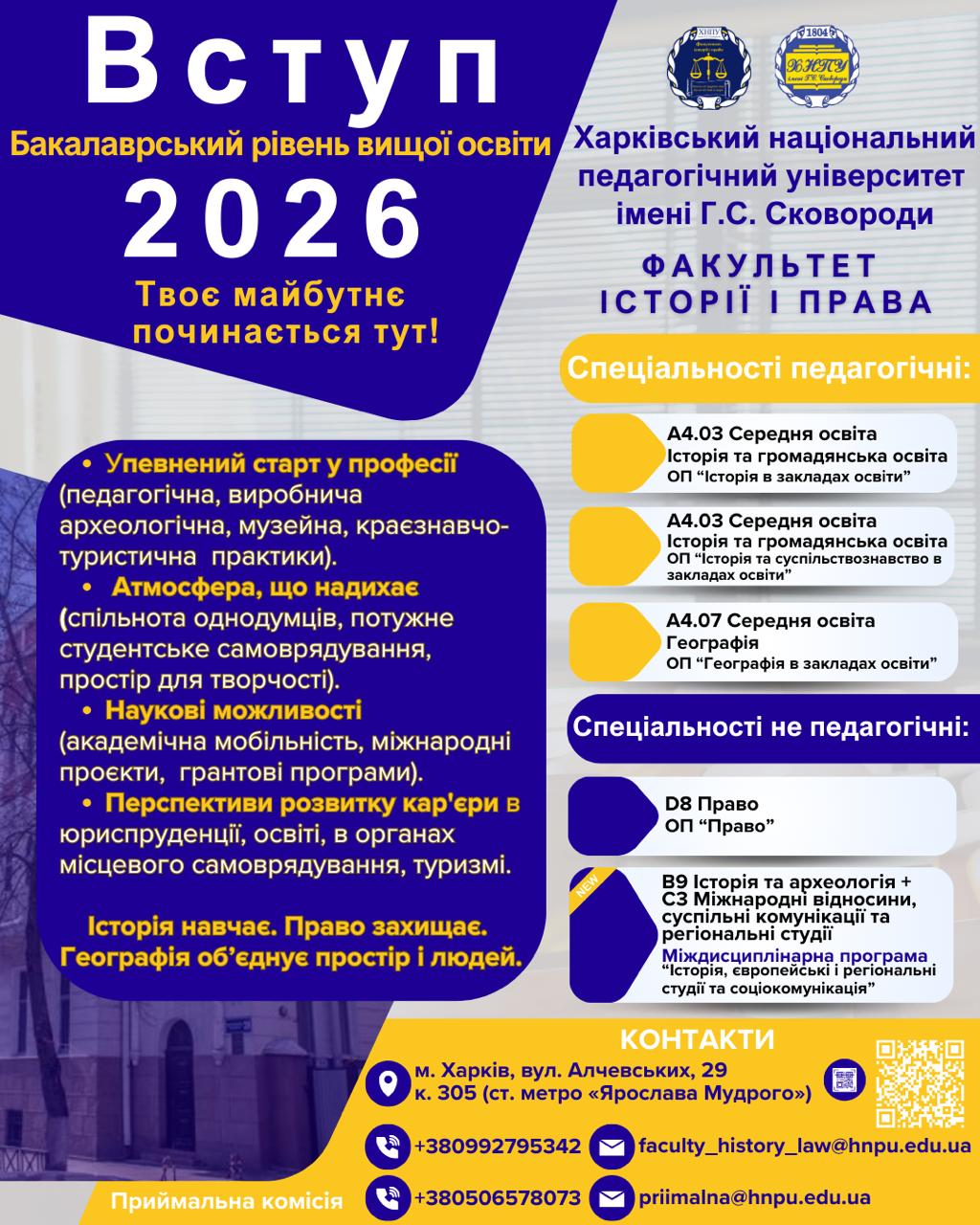 Шановні абітурієнти, батьки, вчителі! Запрошуємо Вас на "День відкритих дверей" (онлайн) факультету історії і права Харківського національного педагогічного університету імені Г.С Сковороди, який відбудеться 17 березня 2026 р. (14.00)!
