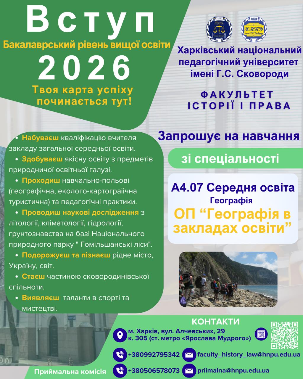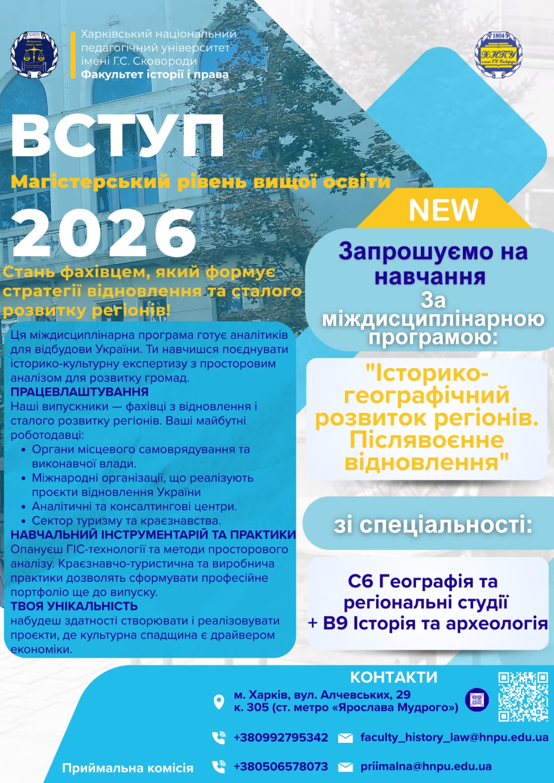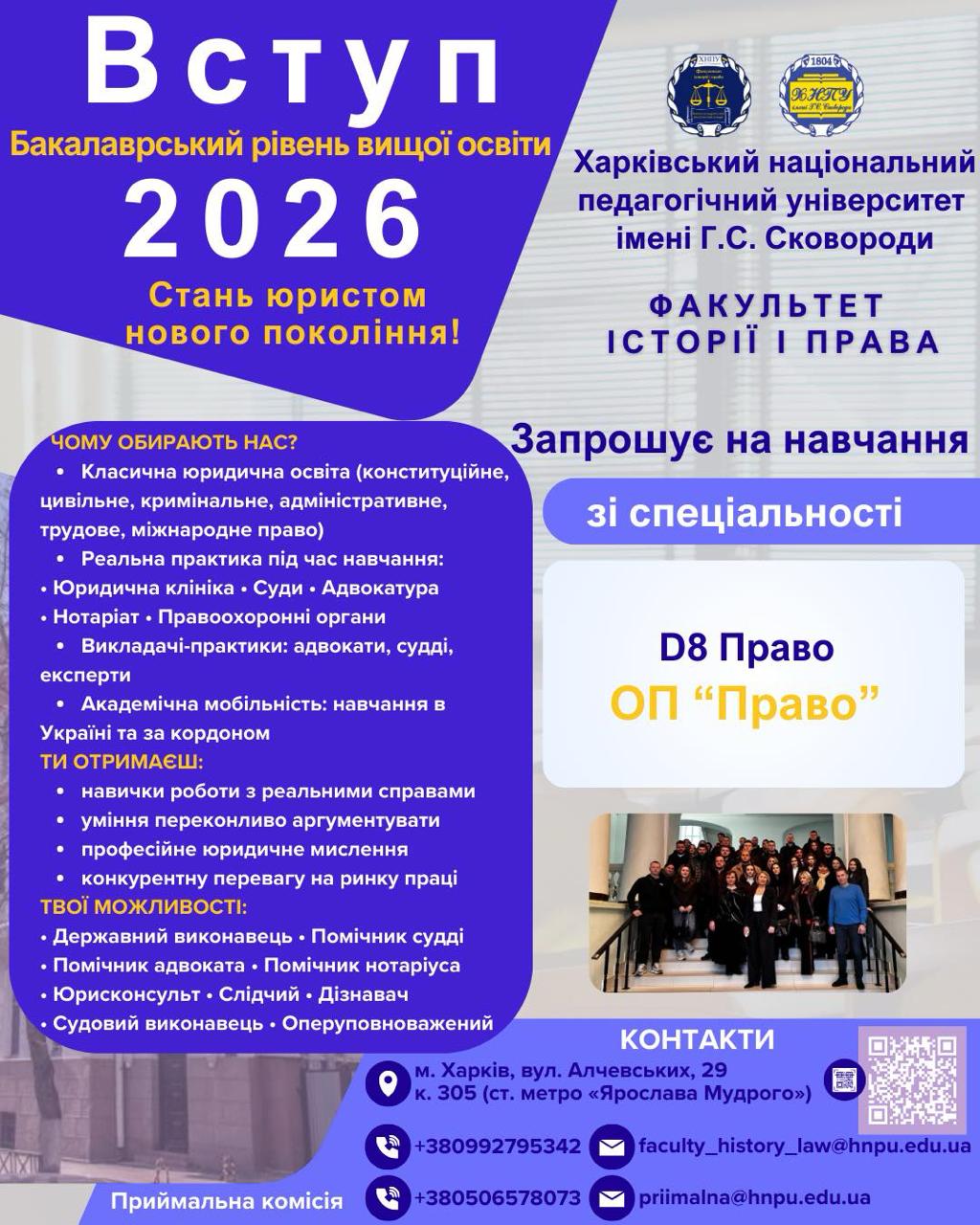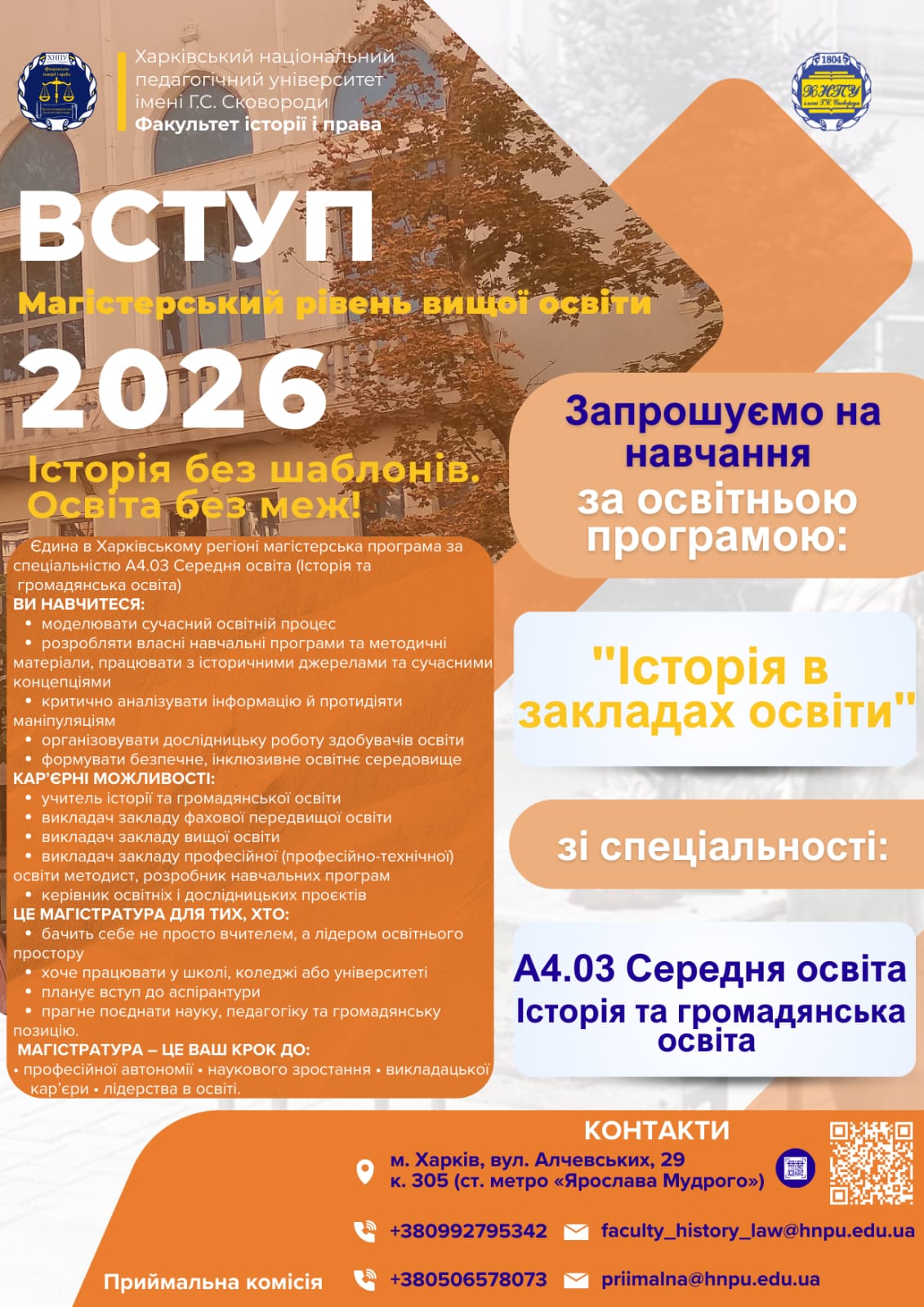 Шановні абітурієнти, батьки, вчителі! Запрошуємо Вас на "День відкритих дверей" (онлайн) факультету історії і права Харківського національного педагогічного університету імені Г.С Сковороди, який відбудеться 17 березня 2026 р. (14.00)!