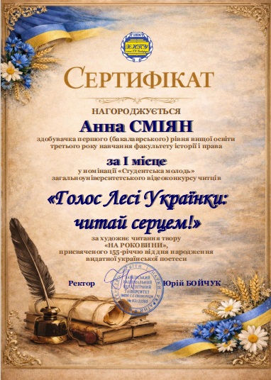 Вітаємо Сміян Анну, здобувачку першого (бакалаврського) рівня вищої освіти третього року навчання факультету історії і права з І місцем у загальноуніверситетському відеоконкурсі "ГОЛОС ЛЕСІ УКРАЇНКИ: ЧИТАЙ СЕРЦЕМ!".